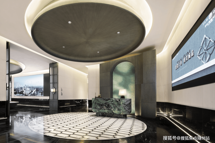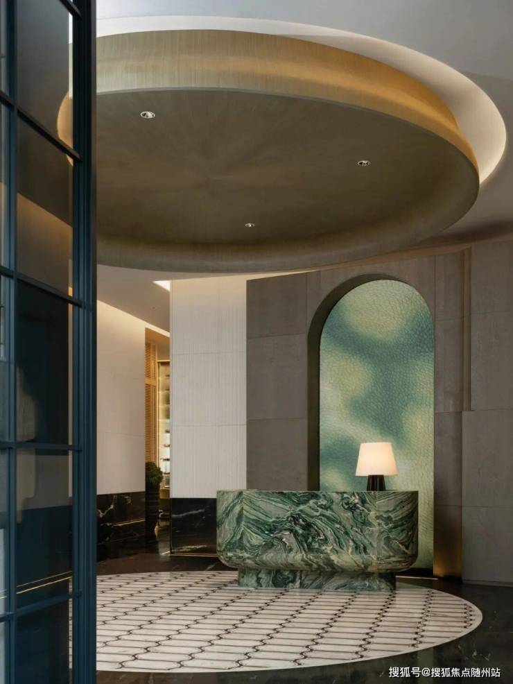 艺术花厅采用中轴对称布局,中央水系搭配晶莹吊灯与周围接待设施,营造出7米挑高的空间既有韵律感又不乏灵动的波光水影,与室外水景绿树相呼应,开启归家的仪式感。