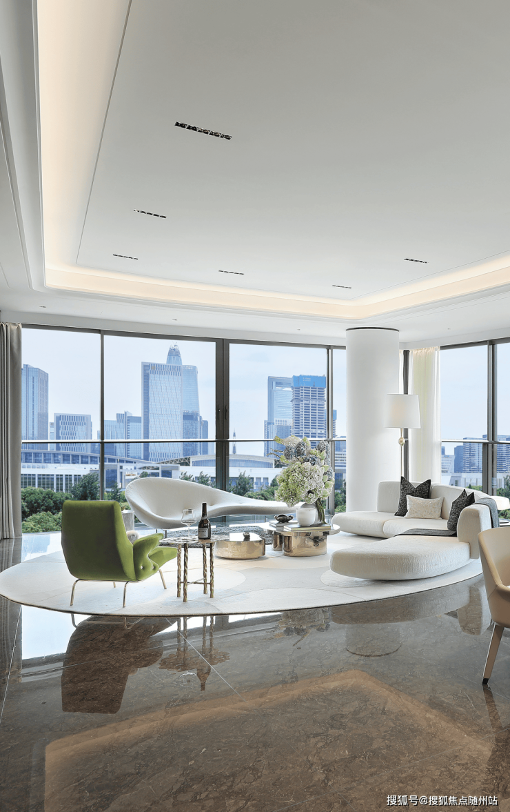 客厅即景框:约50㎡的客餐厅空间,东西开间约8.9米,南向开间约6米,IMAX宽幕视界,将甬新河与园林盛景尽收眼底。