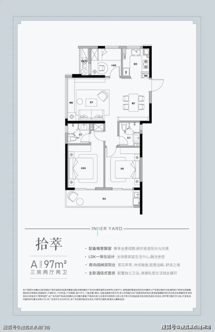 建面约97㎡三室两厅两卫户型都是边套,三面采光,还有很难得的6.4米南向双阳台,3.9米的景观大飘窗,类似的尺度市面上基本要120㎡的户型才能做到。