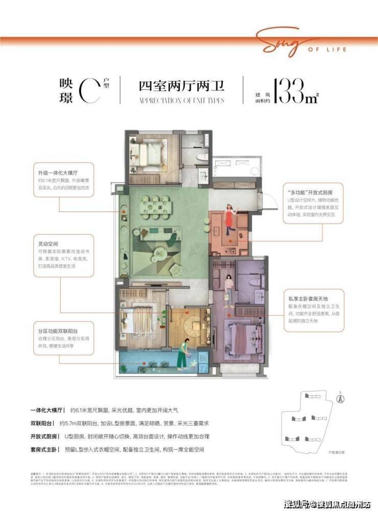 约133㎡户型点评:约6.1米宽尺飘窗,采光优越,室内更加开阔大气,约5.7米双联阳台,加设L型俯景面,满足晾晒、赏景、采光三重需求,U型厨房,封闭敞开随心切换,高效台面设计,操作动线更加合理,预留L型步入式衣帽空间,配备独立卫生间,构筑一席全能空间!