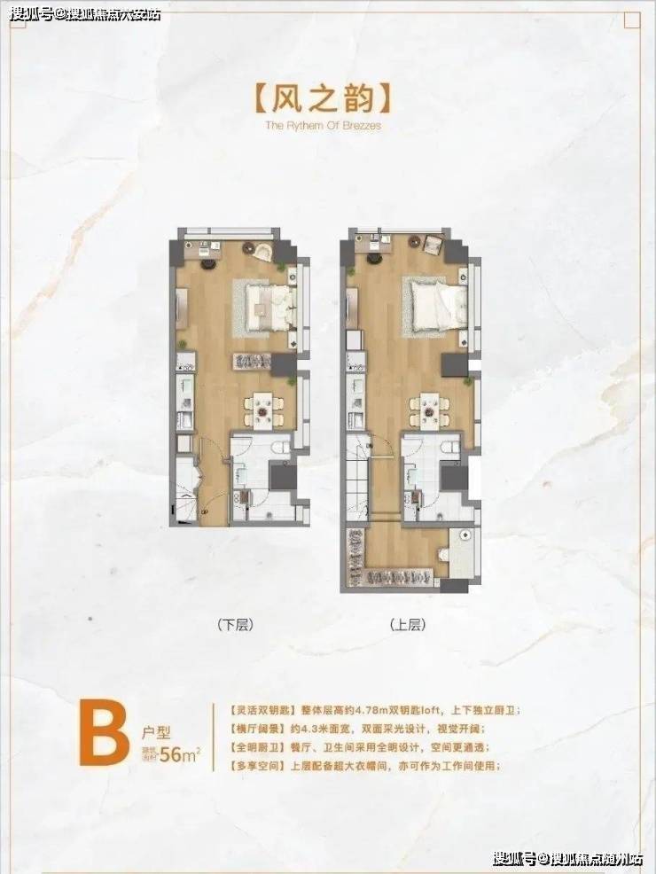 韵动城LOFT建筑面积约50-56㎡,复式双层设计,层高约4.78米,畅享自在高处生活。总价88万起!