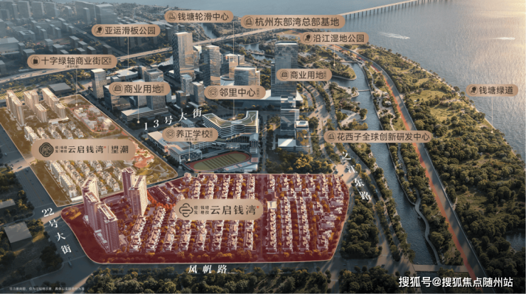 建发·云启钱湾·望潮位于杭州钱塘区东部湾新城的核心区域——金沙嘴,是钱塘江城区内的最后一湾,也是东部湾新城三大核心组团之一,片区定位为总部经济为基础的都市CBD,未来将形成企业总部、住宅、商业、公园等超级业态群,是钱塘区重点发展的标志性区域。
