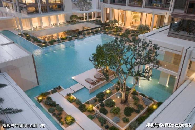 为此他们反复调试了水院底部的瓷砖颜色,以及水的深度,让它与纯色系的石材柱廊、立面,彼此呼应。同时,整个水系也用了和泳池类似的净水系统,不光要在销售阶段保持纯净,今后交付了,同样要打理得纯净透亮。