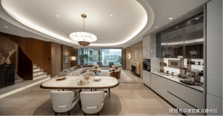 走进室内,近7 米宽的阳台与连贯的餐客厅形成无界视野,站在客厅就能望见阳台外的园林盛景,阳光透过大面积玻璃窗铺满全屋,明亮又通透。