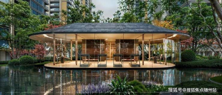 园林整体采用“九庭九屿”布局,将花园渗透至生活每一刻:黑松、百年冬青等名贵植物错落有致,高奢石材铺就步道,细节处尽显品质。同时,园林与全龄漂浮会所无界交融,参考杉本博司“闻鸟庵玻璃茶室”设计的“漂浮”空间,通透明亮,可沉浸式观景、社交,赋予生活仪式感与浪漫。