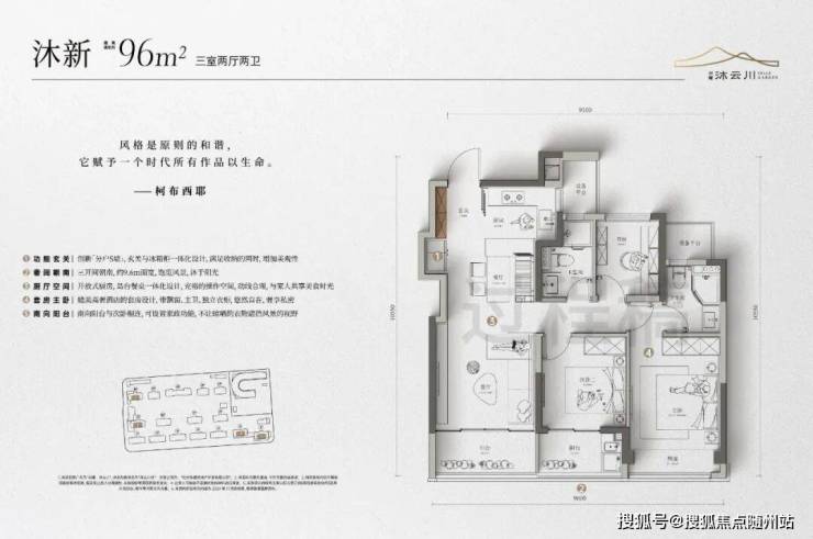 约96㎡三房两厅两卫(中间套):两梯四户,玄关S墙设计巧妙预留冰箱位,空间利用率高;双阳台配置(非双联),次卧隐私性更优,日常晾晒、观景互不干扰。