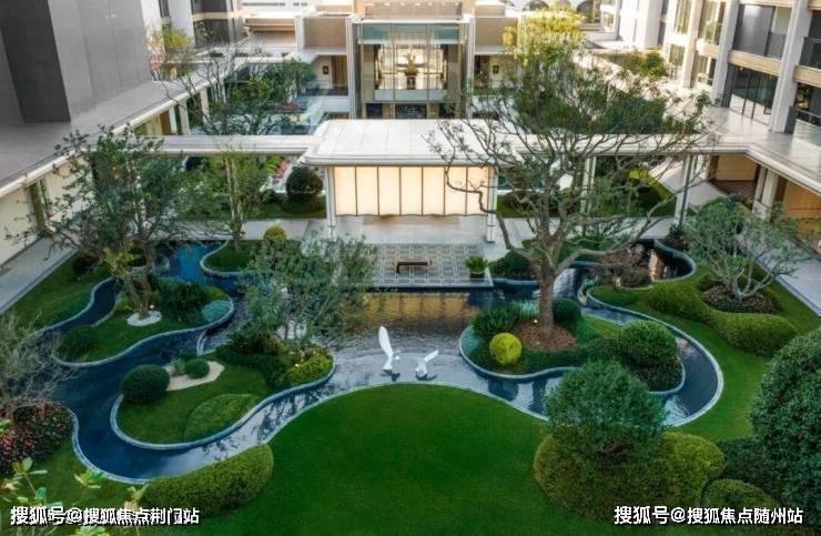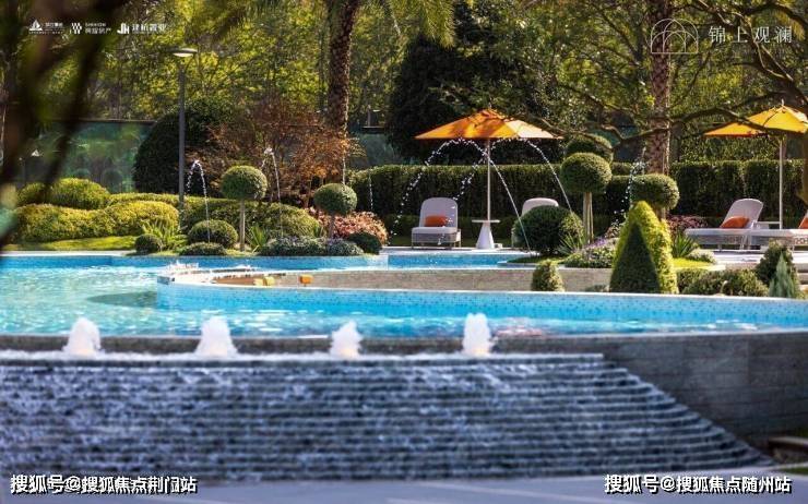 在下沉式庭院的背后,还做出了一片层次丰富的景观,有叠水、有大草坪,还有一大片滨江标志性的「蓝宝石」戏水池,放在这里,跟钱二、奥体的新盘都没什么区别了。