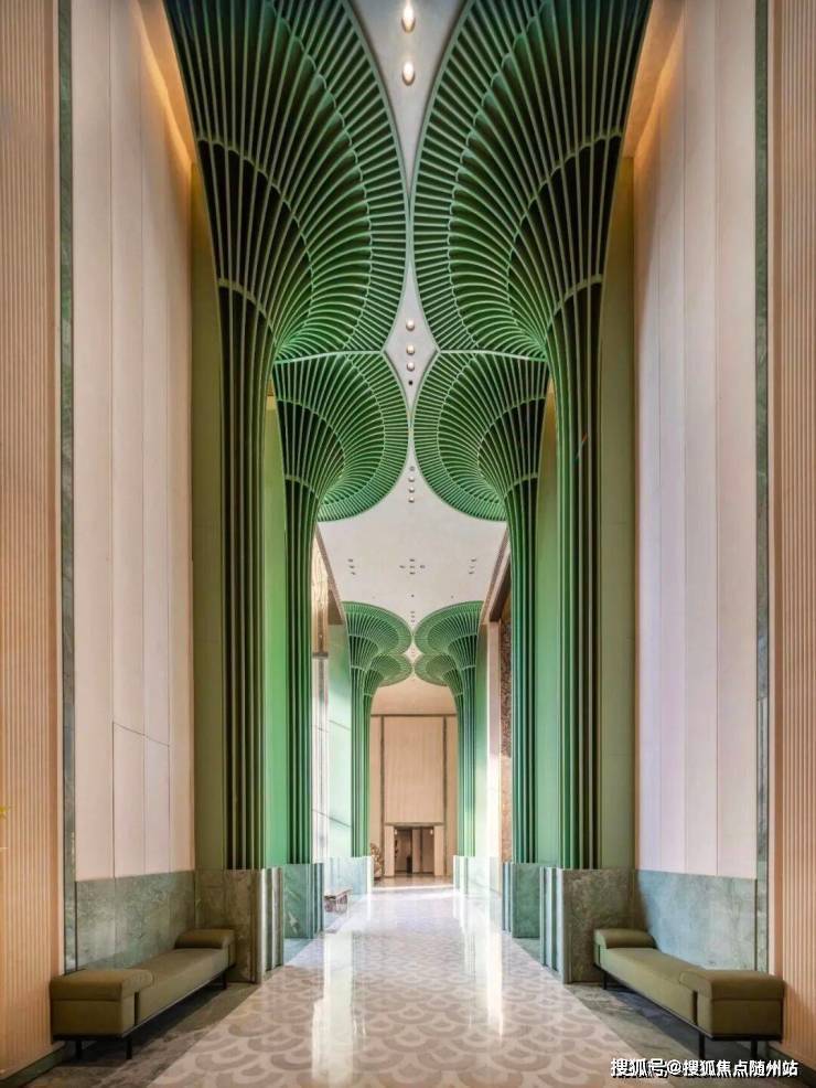 比如约56x11.5米的超尺度门庭,顶部以杭州折扇为造型灵感,寓意“藏风聚气”;四周还有12片巴西进口的百达翡绿奢石雕琢的玉石屏风;中间还有约9.6x5.3米的巨幅铜门,是由非遗传承人朱炳仁手工锻打,再现钱塘潮涌的磅礴气场。