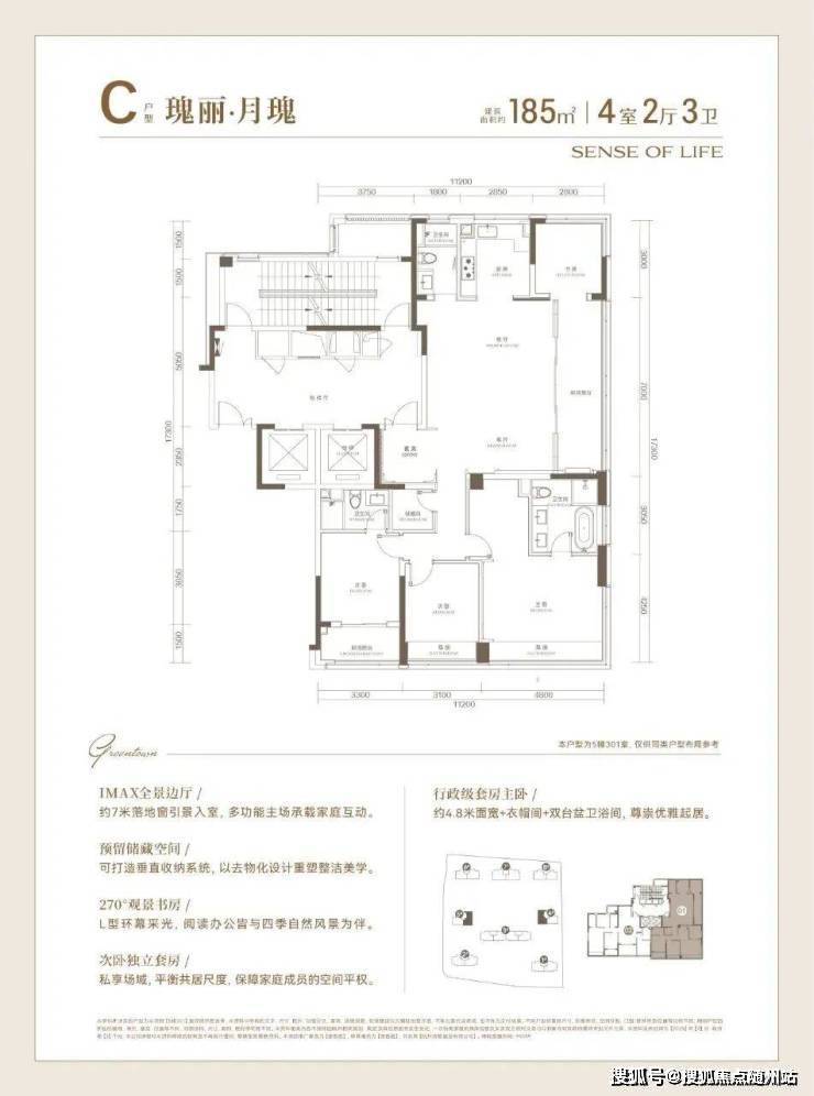 建面约170方户型实现“主卧小家化”,奢华套房式主卧,奢配衣帽间+双台盆卫浴+浴缸,同时配有大飘窗,采光和景观面不输大客厅。