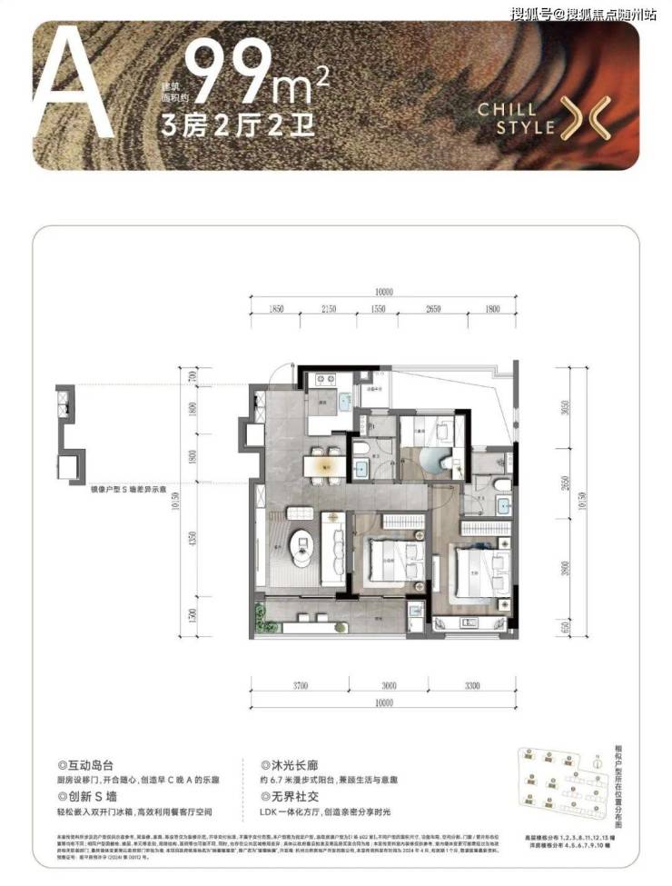 而且户型设计上,也把「社交枢纽」和颜控思维发挥到了极致——小高层建筑面积约99方三房两卫户型,与市场上相似产品相比,尺度感更阔绰,收纳强悍,更植入了爆款创新设计。