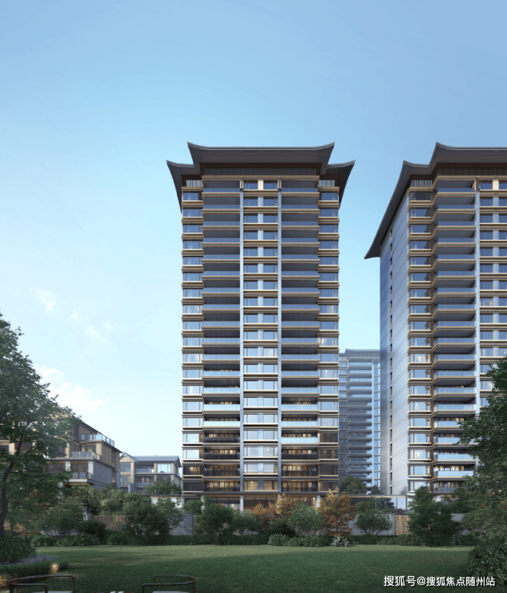 项目由3幢20F高层和3幢5F四联排屋组成,容积率2.5,占地面积约1.4万方,整体体量不大,高层共152套,排屋仅12套。产品整体风格依然是建发新中式,高层户型面积约199㎡,排屋户型面积约373-378-447㎡