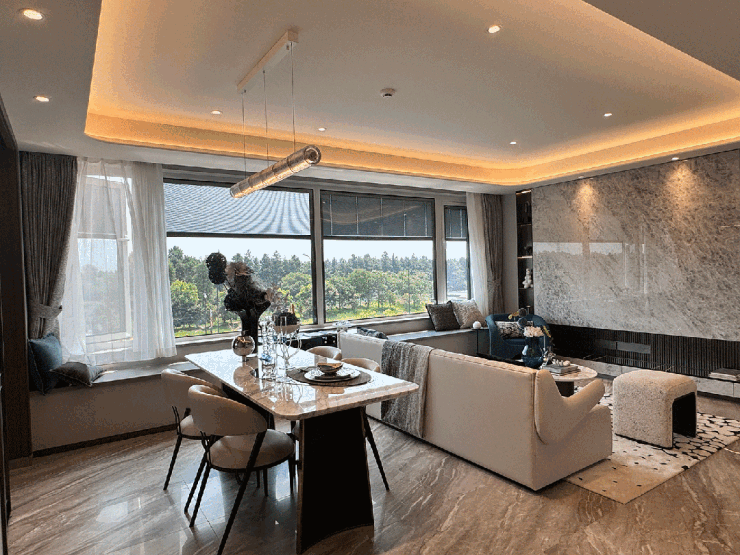 内部景观:项目打造约7万㎡一体化公园,构建“一心、三岛、五进”园林景观,涵盖蓝宝石水池、自然岛屿、流水之庭、浪漫花径、金石门扉等,与外部的龙安湖公园、中央绿廊等连成一片,拥享多公园环抱。