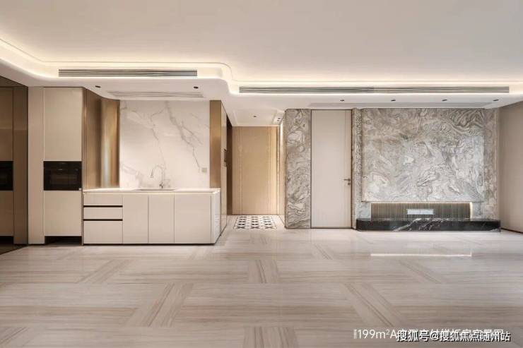 地下光厅同样采用了海派轻奢风格打造,金属背景墙、岩板墙面、水磨石地面及铝板+发光云石吊顶,营造出酒店式归家感。