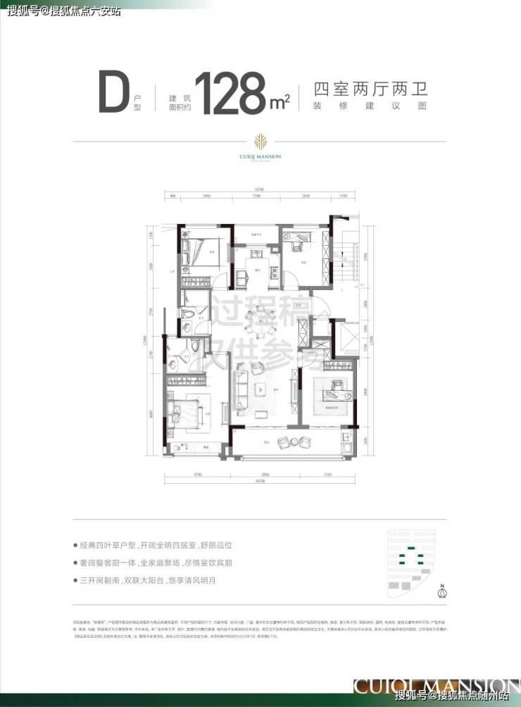 建面约128方采用了深受市场认可的经典的四叶草格局!这种户型的显著特点,就是消灭过道。客厅居于房子的中心,可以直接到达卧室、书房、厨房等各个空间。另外,4个功能间居于四角,对私密性的维护也和当下社会注重隐私的需求不谋而合,即使是孩子、长辈同住,也能有一个很好的家庭秩序。