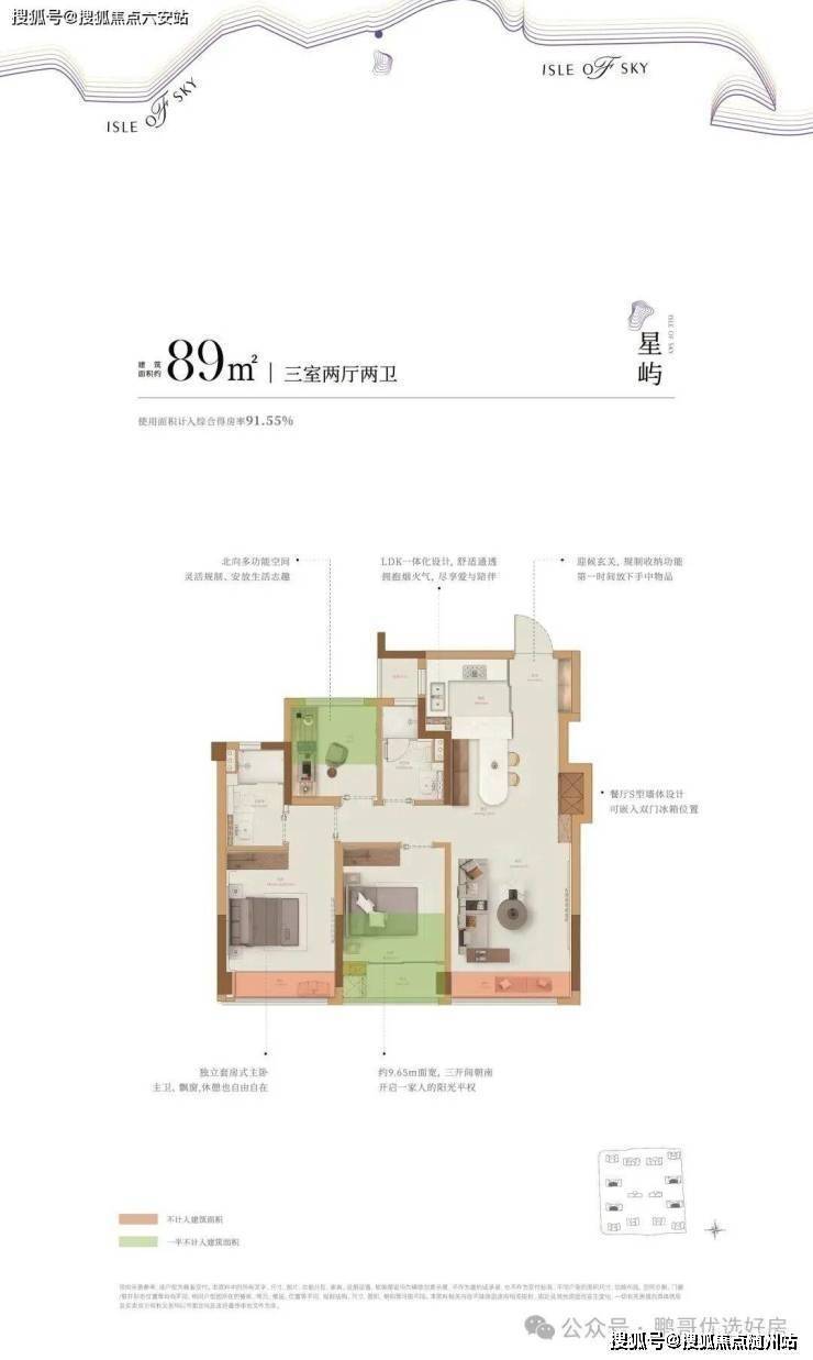 建面约89㎡三房:四开间朝南,南向面宽9.65米,U型厨房+嵌入式冰箱,得房率约91%;