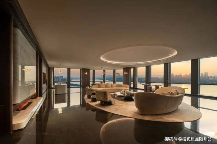 建面约405㎡琚宾风格:南向直面杭州之门、国博屋顶花园,客厅面宽达12米,餐客厅一体空间可容纳20人宴会。