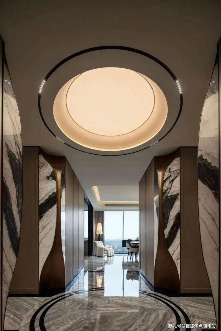 约300㎡“观湖”,谢柯打造;另一款是更宽舒的约412㎡“行云”,出自邱德光。尤其是约412㎡“行云”,无论玄关处雪花白、劳伦黑金、金世纪的大胆拼花,瓦楞式的波浪形电视背景墙,还是吸睛的普拉达绿石材吧台,全屋随处可见出色审美和奢华材质的完美结合。
