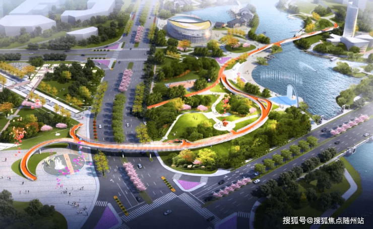 “揽月桥”与“凤鸣桥”两座地标人行桥,相互呼应。西段盘于两岸的龙首“揽月桥”,东端驾于河面的“凤鸣桥”,连接首位两岸的自行车绿道——吴梦浮步,构成龙首接凤尾的景观结构。