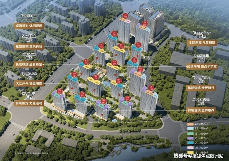 项目公项目外立面采用公建化设计,四面铝板+玻璃幕墙+石材基座;打造了“两轴一街九境”的景观体系,规划了约2000㎡的中央泳池综合体,架空层泛会所规划约1800㎡的全龄主题架空层,设置了阅读、健身、儿童剧场等9大功能区。