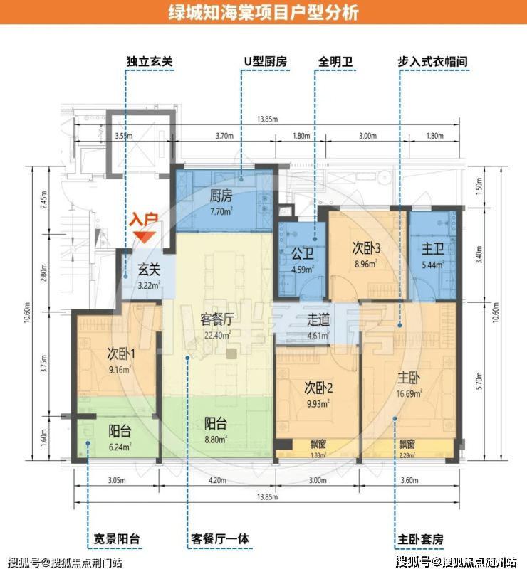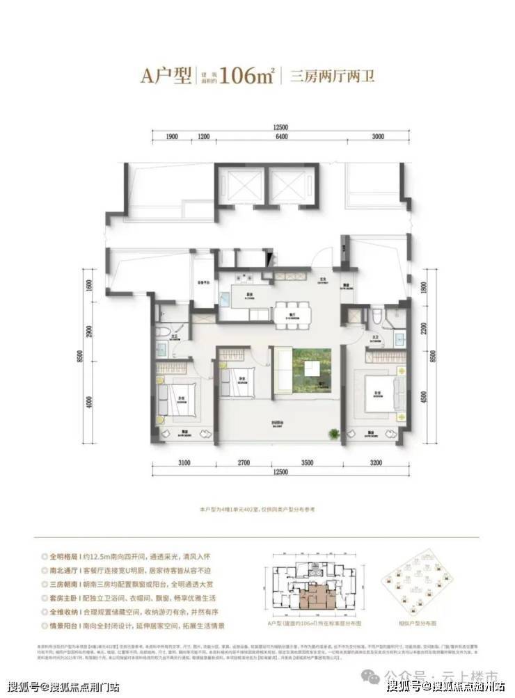 106方的起步户型,居然做了4开间朝南,南向3个房间,整个南向采光面达到了约12.5米。