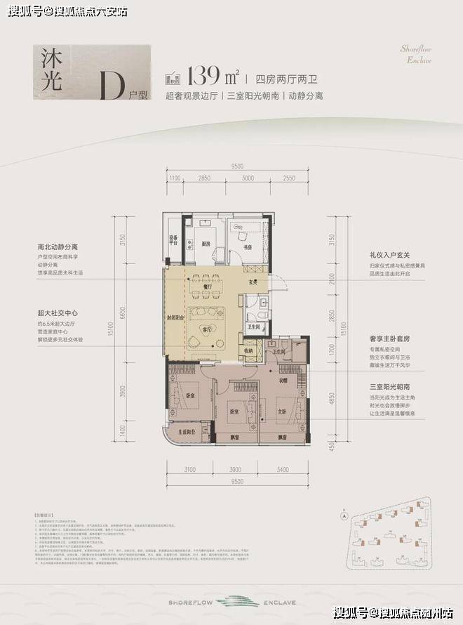 这款户型堪称四开间朝南的“流量王者”,南向面宽约13米,双联阳台+双飘窗设计,视野和采光优秀;套房主卧、双阳光次卧,颇有大平层的气势。