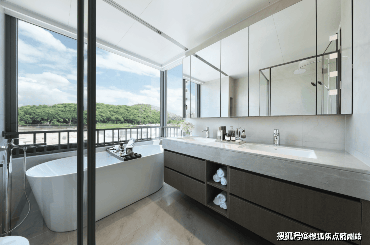 建筑美学上,高区以极简笔触勾勒,超纤细Bezel-less边框、大幅窗墙比与四面铝板公建化立面,彰显力量与序列感;低区基座选用白玫瑰石材,大面积玻璃与金属线条,营造温润亲近的体验。
