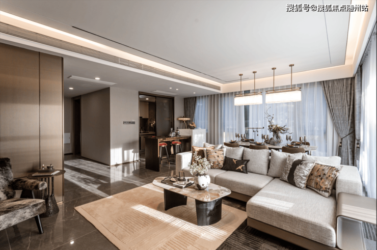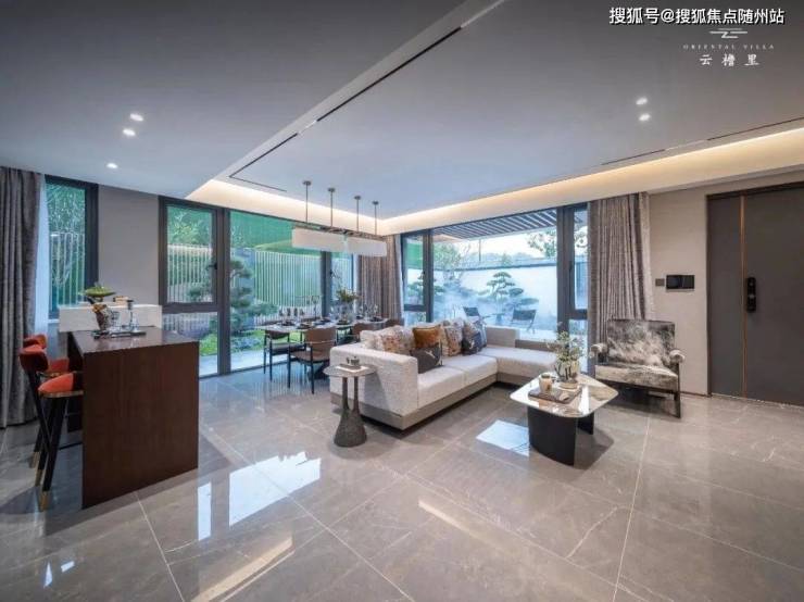 院子营造亲子互动的合家欢场景:孩子、小动物可在绿茵茵的草坪上肆意撒欢。这样的场景真美好。从院子走进客厅,迎面而来的空间宽敞、光线充足。一来是因为拥有95%的得房率,足以傲视当下一众高层产品,另外下叠做了一个“L”型的采光面,视线加倍拉长,所以这个客厅看起来特别通透。