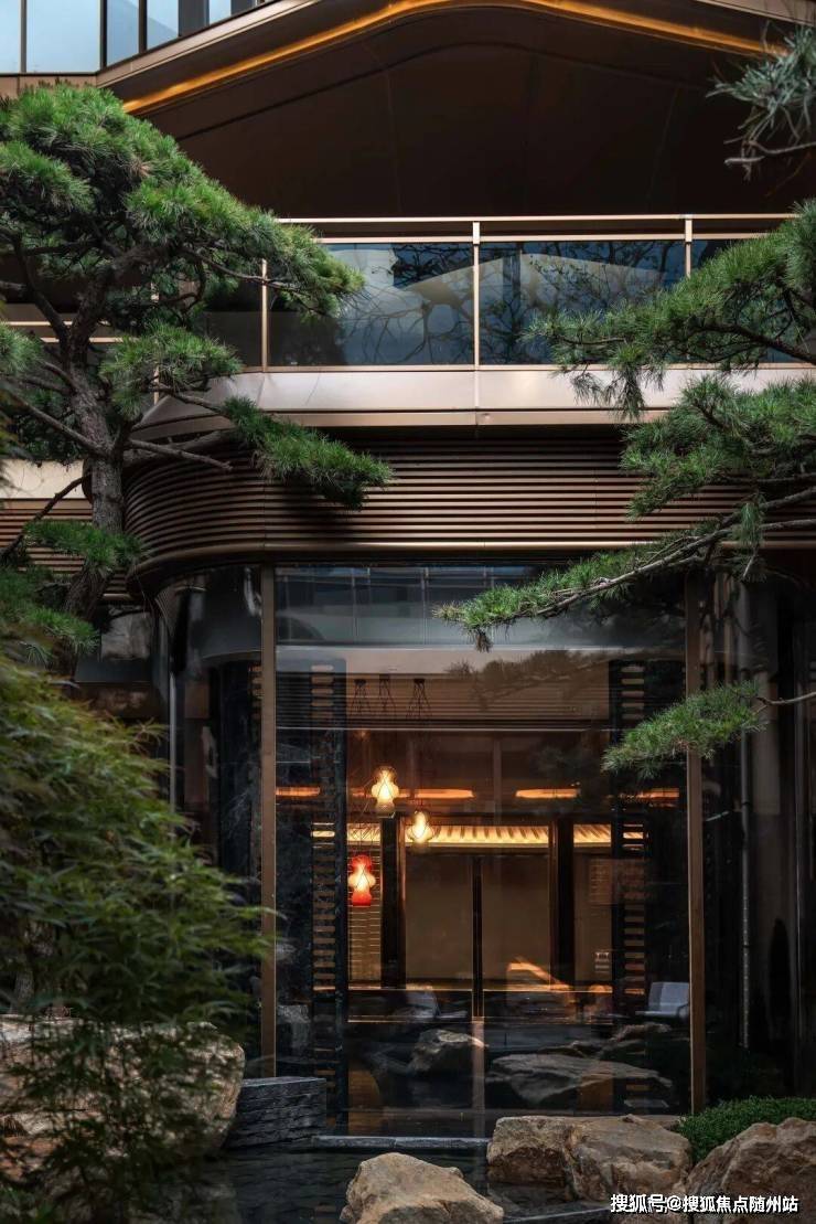 黑松迎宾,太行金石皮摹写山水肌理,开启松间画屏的宁静序章。斗拱、榫卯、拱门、丝织元素转译舒卷归堂的东方美学,穹顶之下,归家即享恢弘妙境。叠石、壑松、理水相映,约15米超尺叠瀑倾泻而下,以“银河叠水”奇观展现动态的《溪山行旅图》意境。下沉茶室静对流水,独拥“月映听泉”之幽。