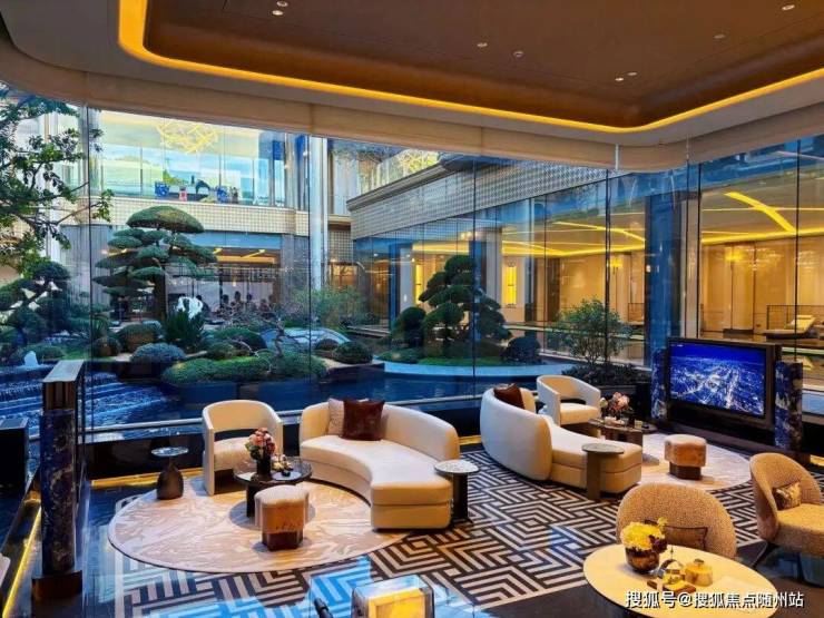 再往里面走,穿过前厅酒店式大堂,就能看到下沉式景观庭院和中央景观水系。景观打造都是以奢华酒店、著名公园为灵感设计。