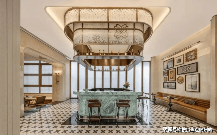 入园大堂正对二进水景中庭,曲折游廊与飞檐景亭合围了一方“四水归堂”的意境,这处借鉴「柳浪闻莺」的布局,经由高端宝格丽奢石点缀,铺陈一片自然青绿。