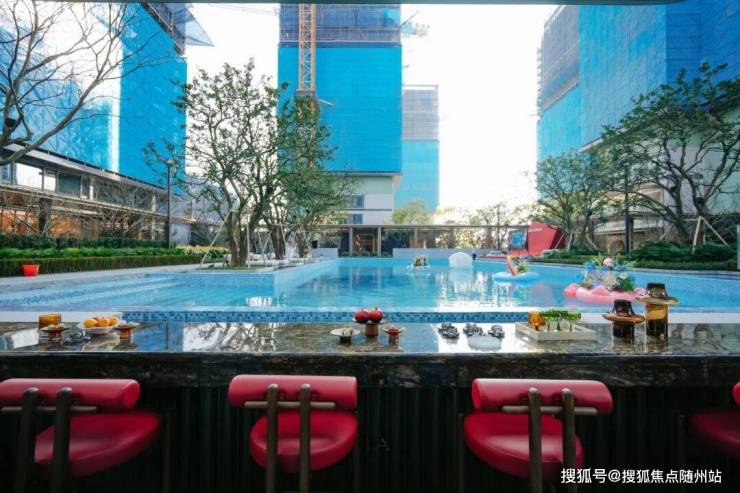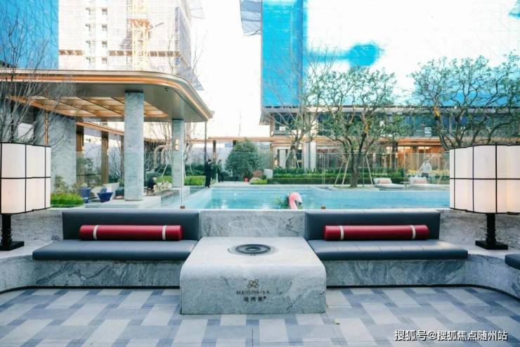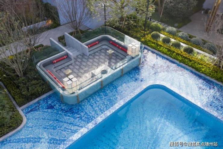 知海棠的泳池,绿城升级为了一座功能复合泳池综合体,深浅分区,动静相宜,四周以风雨连廊串联,既可远观水景,亦宜漫步池畔,容纳了游泳、戏水、休憩及社交等多种功能。
