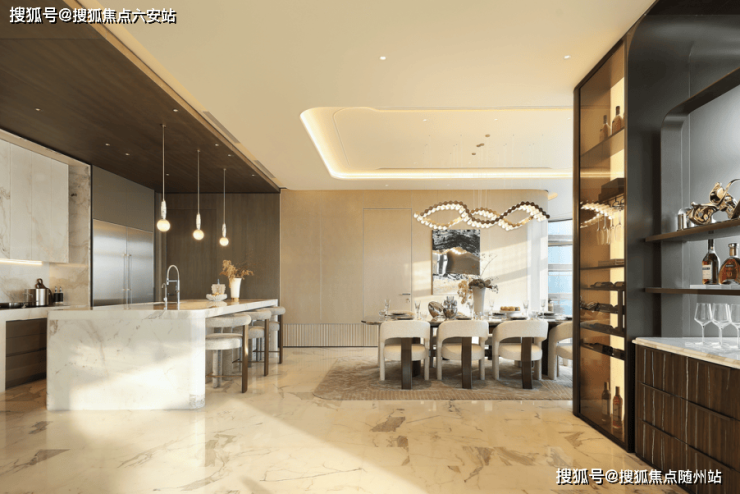 约200方会客厅高约3.7米,营造高厅阔邸,约24米落地窗带来270°视野。2.9X1.55米超大岛台重定家庭社交中心,专为习惯国际顶豪生活的客户设计。