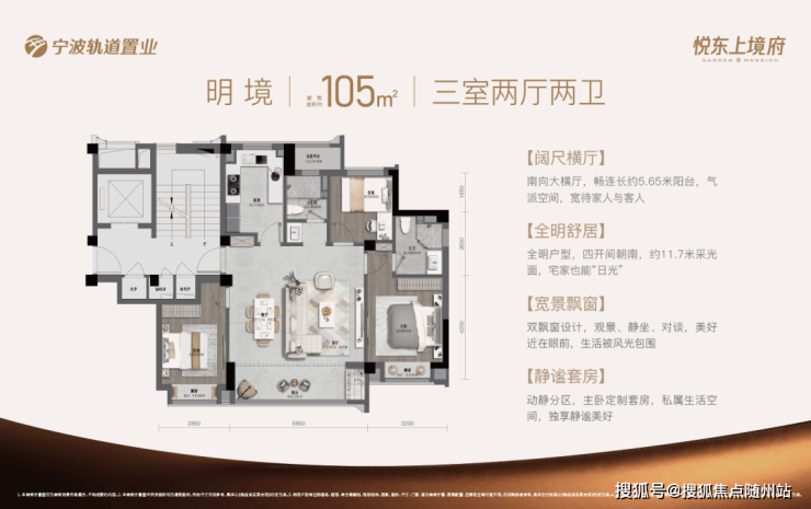 在99-139㎡的产品矩阵中,约105㎡往往承担着“高性价比改善入口”的角色。悦东上境府对该面积段的常见诉求是:在不浪费面积的前提下,尽量把空间用在刀刃上——比如更合理的动静分区、更实用的收纳体系、更舒适的采光通风面。
