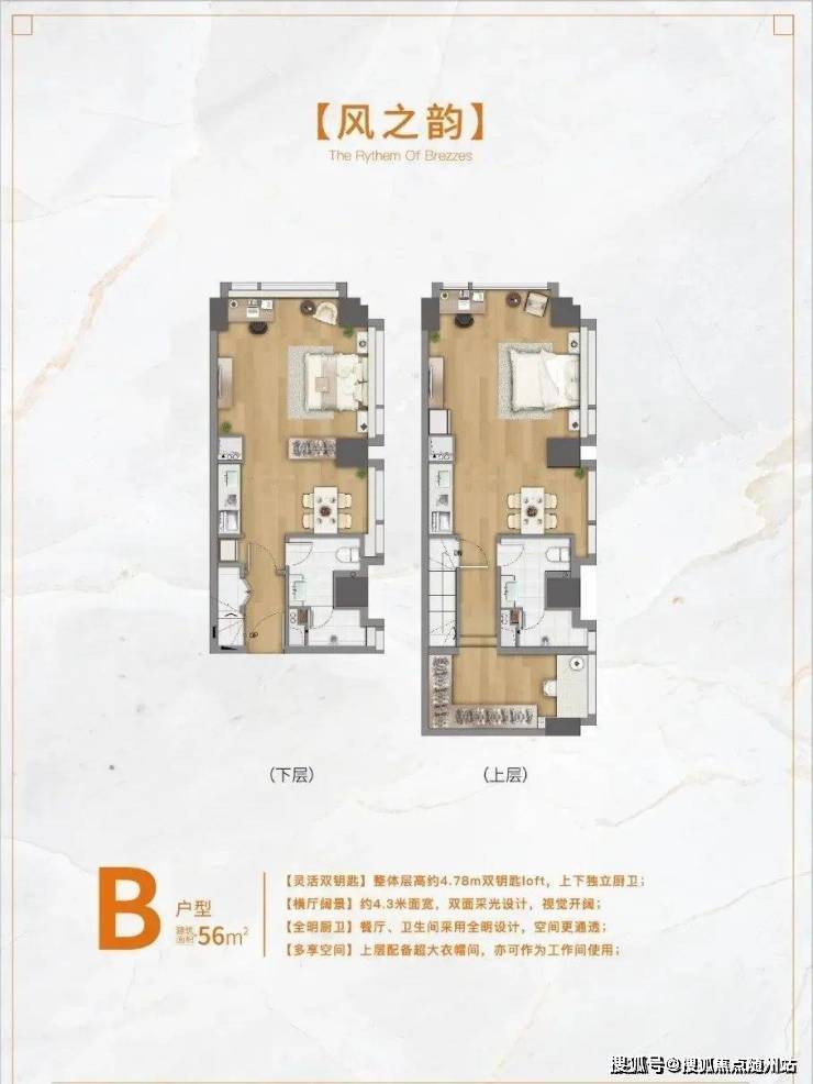 B户型(56㎡):横厅双面采光,全明厨卫设计,宜居性与投资性兼备,年租金回报率稳定5%。