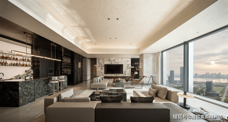 客餐厅作为核心中轴,形成一个多重功能的复合场域。落地窗将钱塘江的天际线引入室内,呈现出开合自如的呼吸感。