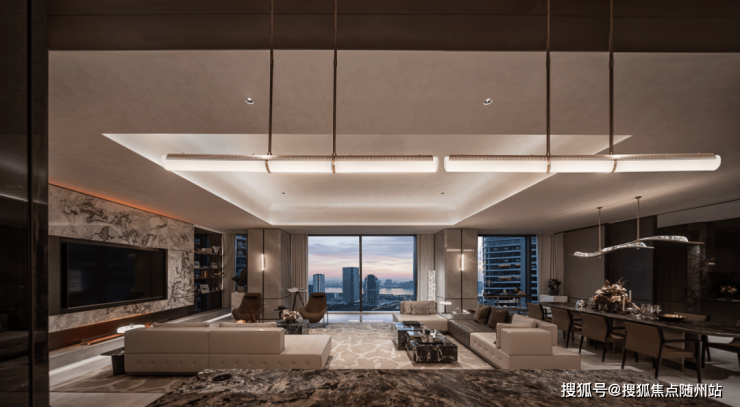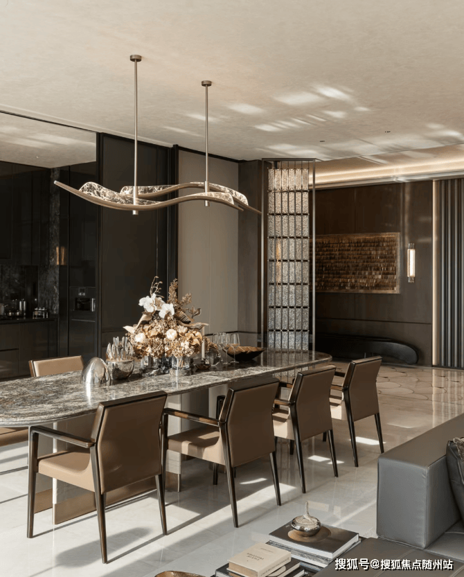 长桌石材深沉的纹理,在餐厅内映衬着波浪形吊灯,光影在金属与石面间流转。暮色下,餐椅围合出附有礼序的交流场域,光线沿着窗边柜体,映照出餐叙时刻的暖意。