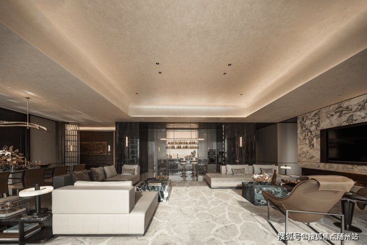 低矮而松弛的沙发围合出交流场域,绿纹石茶几与米色地毯在质感上形成互补,温润与克制并存。