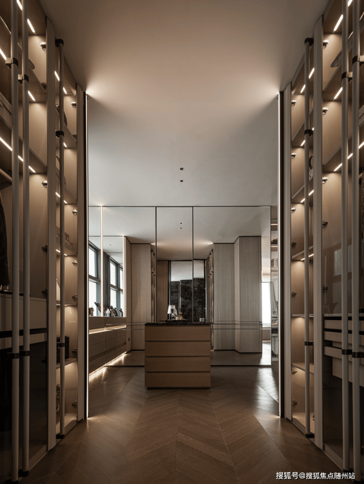 通高柜体以浅木与玻璃门组合,构成衣帽间边界,岛台让动线更为灵活。墙面整体镜拉长纵深,自然光从侧窗导入,空间设置让主卧与浴室得以回游。