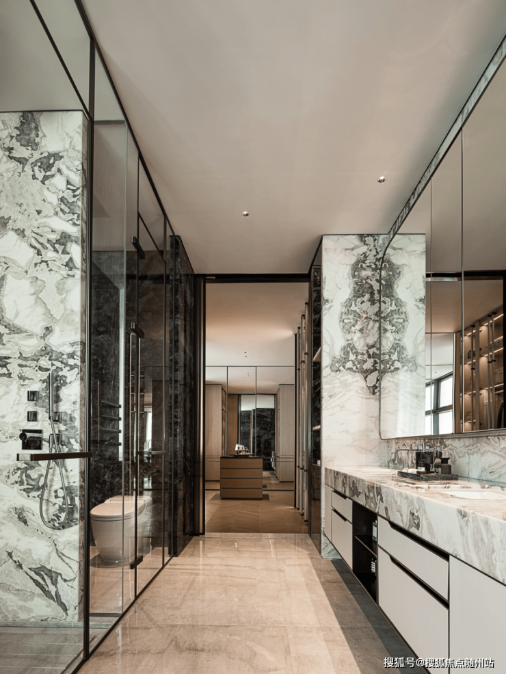 从过道走入私域,木饰面与暖灰石材交替铺展,灯壁与艺术作品点缀其上,像一段被压低声调的序曲,在主卧内,铺垫出细密的节奏。