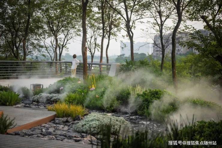 园区以四季植物搭配、森系香氛、专业音响等设计,营造“四时四感”的沉浸体验;并配备智能降温降尘系统,通过水喷雾系统与景观雾森,优化微气候,让夏日归家多一份清凉。