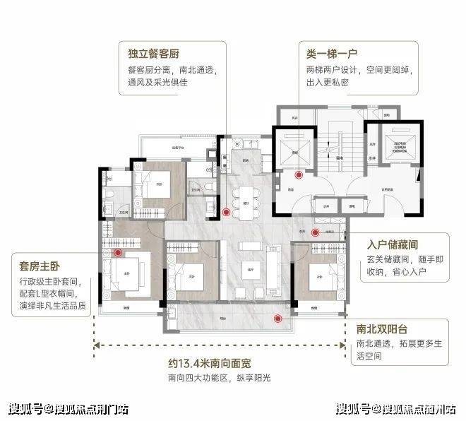 2T2户设计,带入户电梯厅。私享墅级入户体验约13.4m超大面宽采光,餐、客、厨一体化竖厅设计,更享三居室朝南。一孩家庭,兼顾父母与孩子惬意舒居;二孩家庭,阳光平权,俯瞰园林景观,同享自然风光。