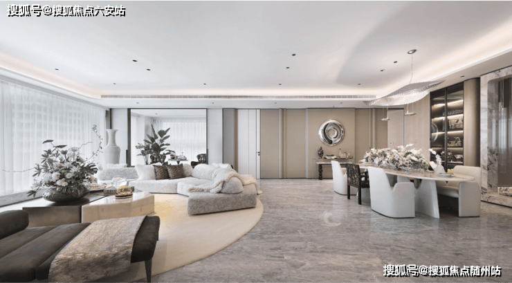 东区建面约320户型,将艺术感进一步融入日常中。特别设计的专属门厅空间,是从电梯厅延伸到家,如同一处艺廊,放慢人的情绪;室内选用了浅金色奢石(外界也称其为“芬迪白大理石”)作为主要的石材,曲面的木饰面也为浅色,整体给人以明亮感。
