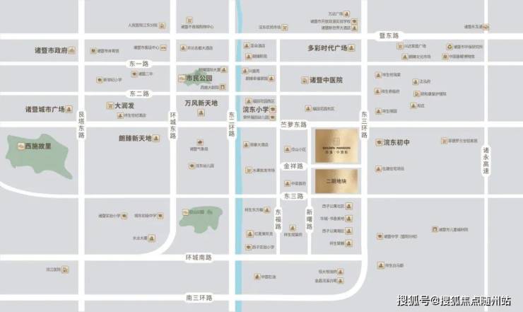 区位占位:落子诸暨城东核心板块浣东街道,东三环线与苎萝东路交汇处,坐拥城东新城发展红利,毗邻高湖生态区规划带,形成“一轴双核三园”的城央生态格局。
