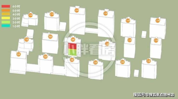 锦上观澜湾的分析结果是这样:计算已考虑周边所有建筑的影响,结果表明由于周边规划尚未公示,暂且不建,楼栋仅受地块内部影响。(说明:本文日照数据基于公示规划图纸文件,使用专业制作工具完成,仅供参考)