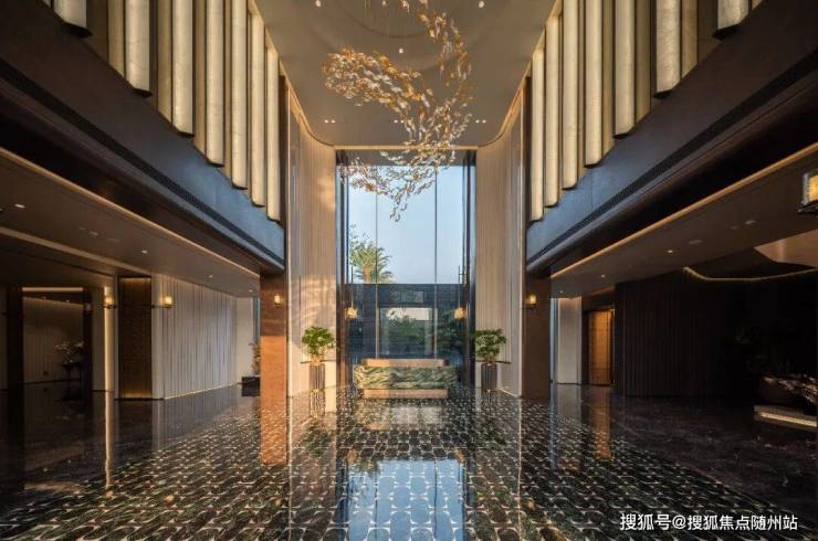 在巨幅挑檐与落地幕墙的勾勒下,约30米超宽幅门庭形成气势磅礴的迎宾界面,一笔绘就潮语臻境府美轮美奂的开场。走近看,4根奢石雕琢的罗马柱优雅伫立,架起约9米高的门头,金光穹顶在两旁镜面水景的倒影下,流光溢彩,潺潺流水更在此隔绝了车马喧嚣,一踏入就恍若置身迪拜帆船酒店。