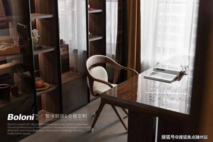 书柜采用“等分阵列式”有门和无门交错的设计,整体颜色选用深色调,突显高贵大气的氛围,背板自带灯展示与收纳两全其美。