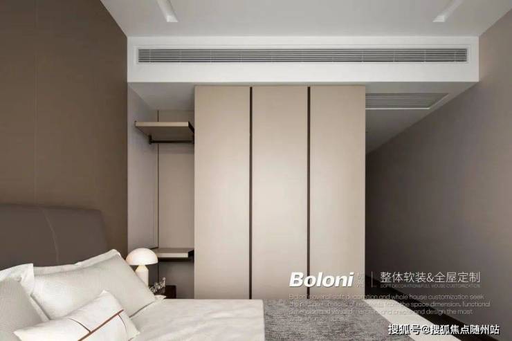 整块到顶的墙板背景用了咖色,衣柜用了浅色,深浅的变化对比,让空间增加了层次,同时床头选了更深的颜色,不同色度在整个卧室像音乐一样律动。