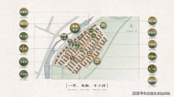 萃取《千里江山图》十二境,不同地势与原景,以主题花木与生活意趣打造不同情境的风雅十二坊,以游赏环步道与十字景观双轴串联,营造闲庭信步的恒美日常。