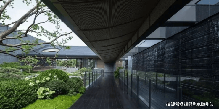 走过约40米和风游廊、黛色青瓦下,踏星而行,复现古时大宅堂前,实现四季有景、步移景异,在自然行径之中,构建「四水归堂」的风雅之景