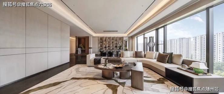 携手国际设计团队,以“云端云影”为灵感,外立面采用流线型玻璃幕墙+香槟金铝板线条,打造建面约310-340㎡精装平层。3.4米层高、270°环幕曲面窗揽城景,主厅演化成U形双转角落地窗,如IMAX巨幕环抱城市天际线,获评“中国建筑工程装饰奖”。